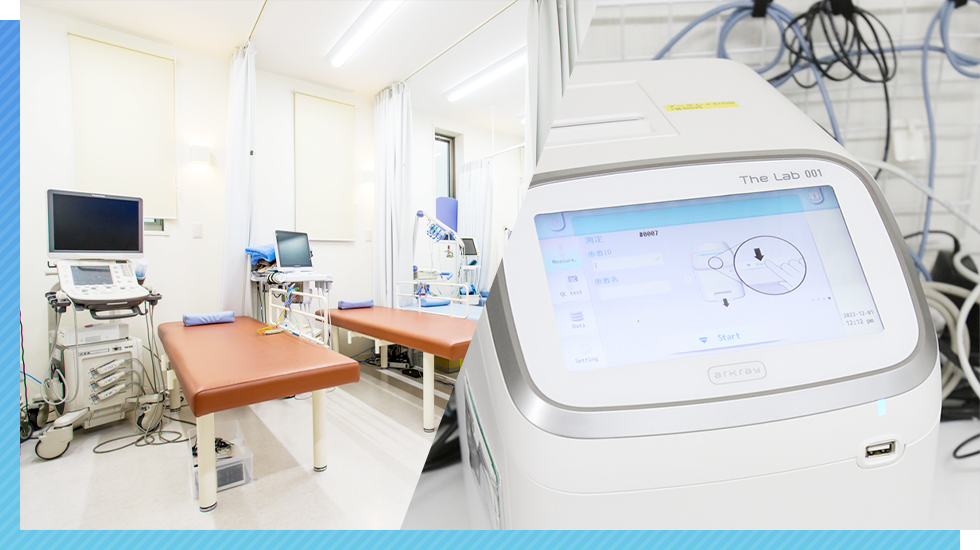 レントゲンや超音波検査装置だけでなく、血圧脈波検査装置、解析機能付心電計、エルゴメータ、全自動血球計数器、グルコース血糖分析装置など内科に関する検査装置を多数導入しています。また、全国でも導入の少ないグリコヘモグロビン分析装置(The Lab 001)を取り入れ、より迅速で正確な糖尿病治療に役立てています。